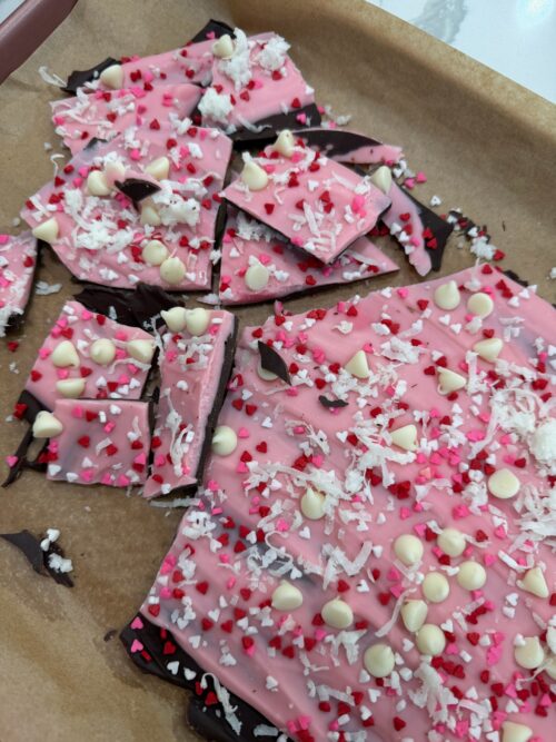 This Valentine’s Day, try this super-easy homemade chocolate bark treat instead of buying something from the store! It is so festive, cute, and perfect for any Valentine’s or Galentine’s party. And not to mention…. so yummy!