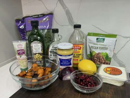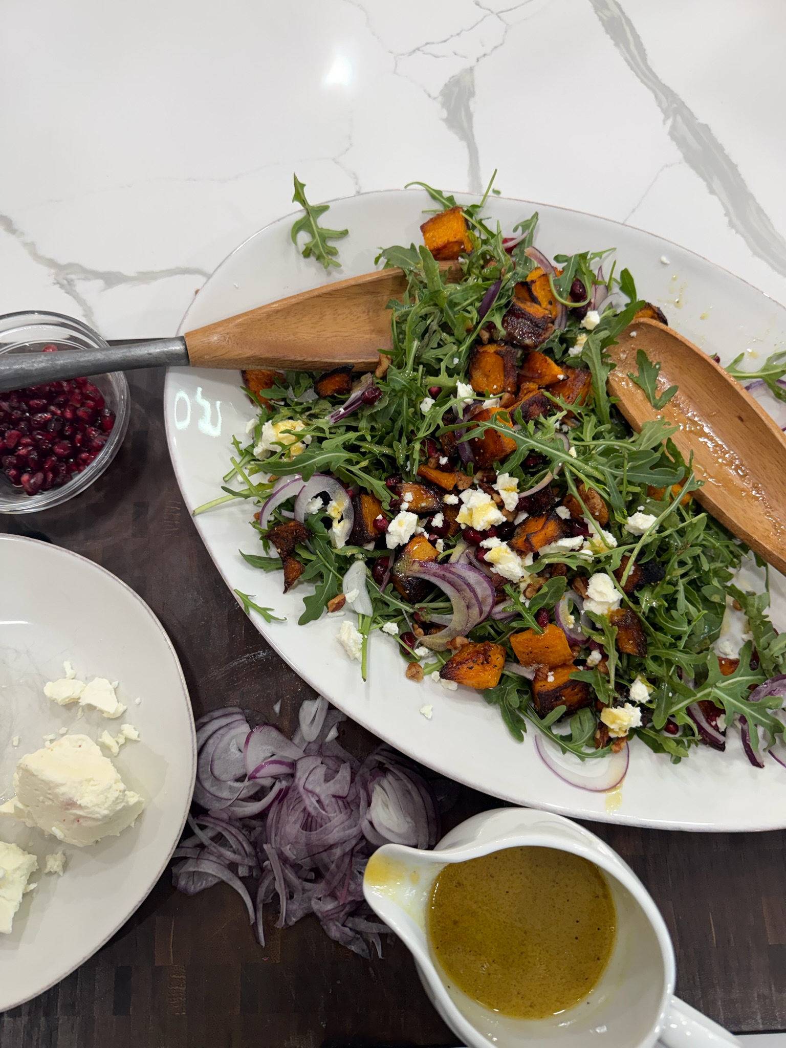 - To a large serving bowl, add the arugula, butternut squash, pomegranate arils, feta, red onion, and pecans. Lightly toss the salad.